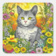 Gato branco bonito e colorido e flores, arte floral amarela. Gato e flores de Ai.