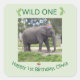 A playful Wild One birthday sticker featuring a gentle elephant wearing a party hat on a soft light‑green background. Leafy accents frame the “Wild One” heading, while cheerful balloons highlight the birthday name below. This design is perfect for safari, jungle, or zoo‑themed celebrations and works beautifully for favor bags, envelopes, and party décor. The name shown is only an example — you can use the personalization tool to change the birthday child’s name and make it your own.