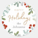 Design de feriado festivo e rústico com texto dourado rodeado por uma borda floral vermelha, verde e dourada.