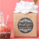 Obrigado na escrita de aparência manuscrita juntamente com os nomes da noiva e noiva, um obrigado excelente para você ou adesivo de favor de casamento para guloseimas! Tema antigo do quadro antigo para aquela velha marca de farmácia. Adicionar texto personalizado para festa ou ocasião. Cinzas de carvão negro e fundo negro com letras de giz branco e decos temáticos antigos.