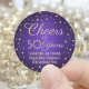 Adicione um toque personalizado de acabamento à festa de aniversário, obrigado a anotações ou favores com esses adesivos roxos e dourados / selos de envelopes. Esta modelo é criada para um aniversário de 50 anos, mas é simples de personalizar para outro ano ou evento, como um aniversário. Design apresenta pontos confetti de aparência de folha em um fundo roxo de aço inoxidável escovado, caligrafia de na moda "Saúde a 50 anos" e uma mensagem editável de tipografia minimalista moderna no fundo. Observe que o ouro é impresso a cor, não a folha metálica.