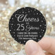 Adicione um toque final personalizado a cartões de agradecimento ou lembrancinhas de aniversário de casamento com esses adesivos redondos de prata falsa preta e cinza / selos de envelope. Todo o texto é simples de personalizar ou excluir. Este modelo é configurado para um aniversário de 25 anos, mas pode ser facilmente alterado para outro ano ou evento, como um aniversário. O design apresenta pontos de confete de folha de prata falsa em um fundo preto, "Brindamos a 25 anos" em caligrafia estilosa e uma mensagem personalizável com tipografia minimalista moderna na parte inferior. Por favor, note que o cinza é impresso para simular prata e não é folha metálica.