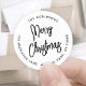 Adicione um toque de fim de na moda aos envelopes de cartão de feriado com as selagens de envelope de endereço de retorno de Feliz Natal. Toda a redação neste modelo é simples de personalizar ou excluir. O design preto e branco apresenta a caligrafia moderna com script escovado e o endereço minimalista da tipografia em círculo. Essas etiquetas de endereço de volta redondas únicas fazem uma adição elegante aos cartões de Natal e aos convites para festas de feriado.