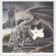 O gatinho de smoking preto e branco está sentado ao lado de um gárgula. Atrás deles está um castelo e dragões.