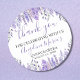 Adicione um toque caprichoso e elegante às lembrancinhas da sua festa, velas, arranjos da mesa, fechamentos de envelope e muito mais com este design de adesivo redondo! Com um charmoso tema de jardim de lilás e lavanda, o adesivo apresenta delicados ramos de lavanda em aquarela em vários tons de roxo, combinados com folhas verdes suaves. No centro, "Obrigado" está escrito em belas letras cursivas roxas, com "por celebrar conosco" abaixo em uma fonte serif simples, criando um lindo equilíbrio entre elegância e simplicidade. Perfeito para celebrações de Quinceañera, este adesivo versátil também pode ser personalizado alterando as cores da fonte ou o fundo para se adequar ao seu estilo. Adesivo Redondo Clássico de Agradecimento Quinceanera Roxo