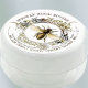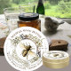 Etiqueta de produto de cera de abelhas com fontes do Velho Mundo em uma armação de ornamentado, vintage com um gradiente metálico de ouro/esguicho e ilustração de abelha rainha da safra. Edite este belo rótulo para usar em outros produtos de colmeias como batom, bálsamo corporal, bálsamo de mel.