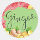 Um rótulo redondo clássico que mostra a ilustração das raízes de gengibre, floração e inscrição. Ideal para os recipientes de especiarias da cozinha ou decoração.
