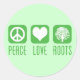 Sinal de paz, Coração, e Árvore sobre fundo verde e Paz, Amor, Raízes texto embaixo.