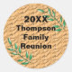 Crie uma manutenção barata para a próxima reunião familiar com estes adesivos únicos. O ano e o nome da sua família aparecem no centro deste autocolante redondo. O texto está cercado por ramos de árvores com folhas verdes brilhantes. O fundo castanho se parece com uma tecelagem cesta ou um padrão de terra rachada. Todo o texto pode ser facilmente personalizado para o seu grande encontro familiar. Perfeito para crianças, projetos de livros de recortes, ou como recordação de guardas do seu encontro especial de família.