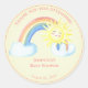 Raparigas personalizadas Rainbow Sunshine Classic Round Sticker são o toque final do seu chá de fraldas sunshine. As etiquetas têm o nome da mãe, o chá de fraldas e a data. Tudo num fundo amarelo texturizado.