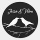 Dois corvos elegantes tocados num galho são a forma perfeita de celebrar o seu casamento gótico. As silhuetas de aves brancas estão contra um fundo preto contrastante. Também excelente para um casamento de Halloween.