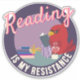 “Reading Is My Resistance” round badge-style sticker features a bold red cardinal lounging with a good book, a warm blanket, a hot drink, and a towering TBR pile. Part of the Cardinal of Resistance series, this purple, mid-century–inspired illustration celebrates the quiet power of reading. A thoughtful gift for readers, writers, librarians, teachers, and book lovers who believe stories open the world. Perfect for laptops, water bottles, journals, e-readers, book carts, and cozy reading nooks.