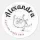 Imagine um esboço branco e preto de um gato de bailarina, em uma das ilustrações de Edward Lear. Os textos são personalizáveis, sendo o nome escrito em uma fonte preta de vintage. O rosto do gato é polido e brincalhão, com grandes olhos expressivos e bigodes proeminentes que acrescentam um toque de encantador delito. O fundo mínimo destaca a delicada composição do trabalho de arte, fazer perfeito para um adesivo. Essa ilustração encantadora daria um presente de aniversário encantador e nostálgico para uma senhora especial que aprecia a estética magra e vintage.