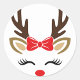 Uma ilustração esbranquiçada de uma face de rena, com grandes olhos fechados expressivos adornada com pestanas longas. A rena tem um nariz vermelho brilhante e um arco vermelho alegre na sua cabeça, contrastando com os chifres castanhos macios.