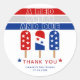 Chá de fraldas de picolés Red White e due 4 de julho Obrigado adesivo redondo em vermelho, branco e azul. A design exibe as palavras 'A RED WHITE AND DUE' em três listras e picolés ou pop de gelo com estrelas juntamente com a frase 'Obrigado'.