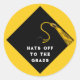 Adesivos de festa de congratulações de formatura com design de tampa preto e dourado em fundo amarelo. Edite o texto para adicionar o nome do graduado e o ano.