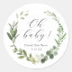 Sele as envelopes de convite ou lembrancinhas com esses adesivos botânicos clássicos "oh baby!". Apresentando "oh baby!" e o nome e data do evento emoldurados por uma guirlanda de folhagem de eucalipto verde em aquarela. Coordena com a coleção Eucalipto encontrada na Loja Zazzle da Adore Paper Co.