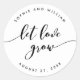 O adesivo de favor de casamento com as palavras "deixe o amor crescer" em uma escrita cursiva relaxada em preto contra um fundo branco. Personalize-o substituindo o texto do marcador de posição. Para obter mais opções, como alterar a fonte e seu tamanho/cor, expanda a curva/contrato ou o espaçamento entre letras, clique no botão "Personalizar". *Observe que a Marca d'água do Zazzle que aparece na visualização de zoom NÃO aparecerá no produto impresso final. © Rosewood e Citrus