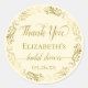 Esses belos adesivos são perfeitos para agradecer os convidados em um chá de noiva. O design apresenta um texto em letra dourada fancy em um fundo marfim ou creme com uma borda de renda dourada em folha falsa. O texto lê-se Obrigada, com espaço para o nome da noiva e a data.
