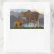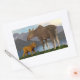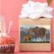 Um alce e seu bezerro bonitinho com um lago e montanhas à distância.