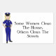 Estes produtos divertidos apresentam uma policial feminina parada e dizendo, "Algumas mulheres limpam a casa, outras limpam as ruas". Um produto divertido para a policial na sua vida. Estes são excelentes parabéns sobre as ofertas de emprego, bem como sobre as ofertas de apreço.