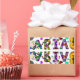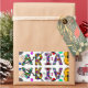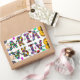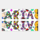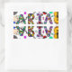Etiquetas de menina, com flores roxas, rosa, vermelha, azul e lacerante e símbolos musicais como guitarra e notas musicais.