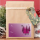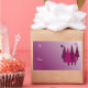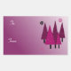Um design moderno com árvores de Natal brancas em tons de roxo sobre um fundo roxo sombreado. Pequenos flocos de neve o acenam.