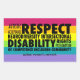 Imagem é um grupo de palavras em letras maiúsculas negras: aceitação autista, respeito, neurodiversidade, interseção, direitos de deficiência, presunção de competência, inclusão, comunidade. O fundo é listrado pelo arco-íris.