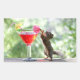 Foto de um bebendo de esquilo fofo um coquetel de um grande copo de martini com dois palitos. O esquilo está sobre os dedos e o bebendo de uma palha de guarda-chuva. Nenhuma Photoshop foi usada para esta foto e é apenas coloração de água e comida no vidro!