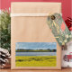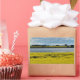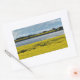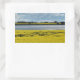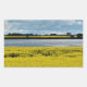 Um campo de canola amarela vibrante floresce sob um céu dinâmico, com manchas de nuvens fluffy lançando sombras na paisagem. Ao fundo, uma banda contrastante de árvores verdes escuras separa o campo de uma extensão tranquila de água. Esta imagem foi tirada perto de Streatham em Victoria, Austrália.