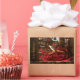 Dragão vermelho sentado no seu gabinete lendo um livro. Por trás estão os equipamentos de podcasts, os computadores e seus tesouros.