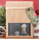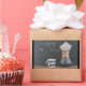 Um quadro atrás diz "tempo do café" com um smiley face, escrito em giz. Na frente, em uma mesa de madeira rústica, há uma caneca de café com um padrão de diamante design a preto e branco. Sentado ao lado da xícara de café está um pote de café com um filtro grande e um pote de café recém-fabricado. Parece rústico e antiquado.