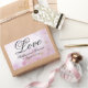 Flores cor-de-rosa suaves quase abstrato definem o tom para este adesivo de casamento romântico e elegante que apresenta a palavra amor em um grande roteiro formal. Os nomes da noiva e noiva estão abaixo e a data do casamento. Fácil de personalizar. Perfeito para selar bolsas de casamento ou caixas de bolo.