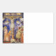 Cena Medieval da Sexta-feira Santa com Cristo na Cruz cercado por anjos. Cor rica em azul, amarelos ouros e laranja.