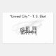 Um desenho de uma linha do horizonte da cidade acompanhado por uma linha icônica de T. S. Eliot's "The Wasteland", publicada em 1922. O poema está no dominio público.