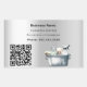 Um adesivo de negócios elegante e glamouroso em um fundo falso, de aspecto prateado, decorado com equipamento de limpeza. Personalize e adicione seu nome, texto, informações de contato e seu próprio url ao seu site ou à sua conta de mídia social ao código QR.