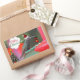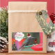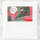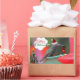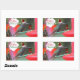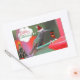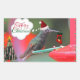 Um colibri verde que veste um chapéu do papai noel senta-se em um alimentador vermelho e verde com uma árvore de Natal decorada no fundo. As luzes de Natal cercam o quadro desta foto original. O hummer está dizendo, "Feliz Natal".