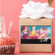 Branca colorida, artística, abstrato, pintura contemporânea de aquarela figurativa com três figuras de jogador, espirais florais, rosas, flores, brilhos dourados, folha prateada em cores vibrantes amarelas, verdes, azuis, cor rosa fuchsia.