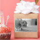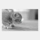Fotografia branca e preta de um gatinho muito fofo com olhos azuis, agachado num chão de madeira, pronto para pular. Um presente de excelente para você ou para o amante de gatos em sua vida.