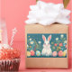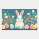 Coelho branco fofo com fundo de flores e ovos de Páscoa em ambos os lados do coelho
