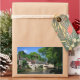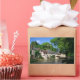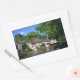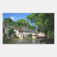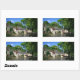 Um autocolante de fotografia de souvenir retangular do castelo e da aldeia histórica de Ségur-le-Château, com as suas casas de meia altura ao lado do rio Auvézère, em Limousin, França.