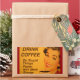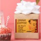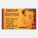 Uma mulher sorridente com batom vermelho retrorado e unhas bebe sua xícara de café da manhã. A legenda diz "Beba café - Faça coisas estúpidas mais rapidamente com mais energia."