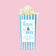 Adesivo de pipoca do time menino para uma festa de revelação de gênero. Design moderno em azul com uma cegonha entregando um bebê. Personalize com os nomes dos futuros pais e a data. Design coordenado em rosa com time menina disponível na coleção. Caixa não incluída.