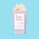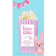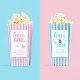 Adesivo de pipoca da equipe da menina para uma festa de revelação de gênero. Design moderno em rosa com uma cegonha entregando um bebê. Personalize com os nomes dos futuros pais e a data. Design coordenado em azul com a equipe azul disponível na coleção. Caixa não incluída.