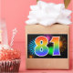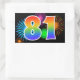 Este divertido e vibrante design de adesivo apresenta um padrão colorido inspirado em fogos de artifício comemorativos, juntamente com o número "81" apresentando um padrão de gradiente inspirado em arco-íris multicolorido, sobre um fundo de cor preta. Adesivos como este podem ser usados em uma festa comemorando o octogésimo primeiro aniversário de alguém, ou talvez para o octogésimo primeiro aniversário de casamento de um casal, ou algum outro evento de número 81. [~Z0000324]
