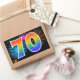 Este divertido e vibrante design de adesivo apresenta um padrão colorido inspirado em fogos de artifício comemorativos, junto com o número "70" tendo um padrão de gradiente multicolorido como um arco-íris, em um fundo de cor preta. Adesivos como este podem ser dados como um pequeno presente enquanto se comemora o aniversário de setenta anos de alguém, ou talvez para o aniversário de setenta anos de casamento de um casal, ou algum outro evento de 70 anos.