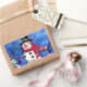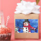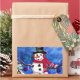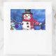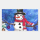 Pintura de aquarela original de Sandra Gale, de um tradicional homem de neve parado em frente a uma cerca de piquete com luzes de Natal brilhantes refletindo sobre a neve do inverno. Pássaros, casas de pássaros, e Enfeites de natal fazem disso uma cena clássica de Natal que parece excelente em papel de embrulho, cartões de natal e muito mais!