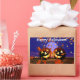 Duas abóboras brincalhão na noite de Halloween são iluminadas com risos com uma lua de cheio atrás delas e folhas de queda voadoras. Com texto personalizável "Feliz Dia das Bruxas!"