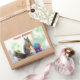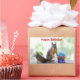 Foto de um esquilo bonito ao lado de dois presentes pequenos envoltos e olhando hetero para a câmera. "Parabéns!" é a legenda, em vermelho.