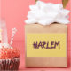 Adesivo Retangular Harlem Text Base Design no Fundo Amarelo